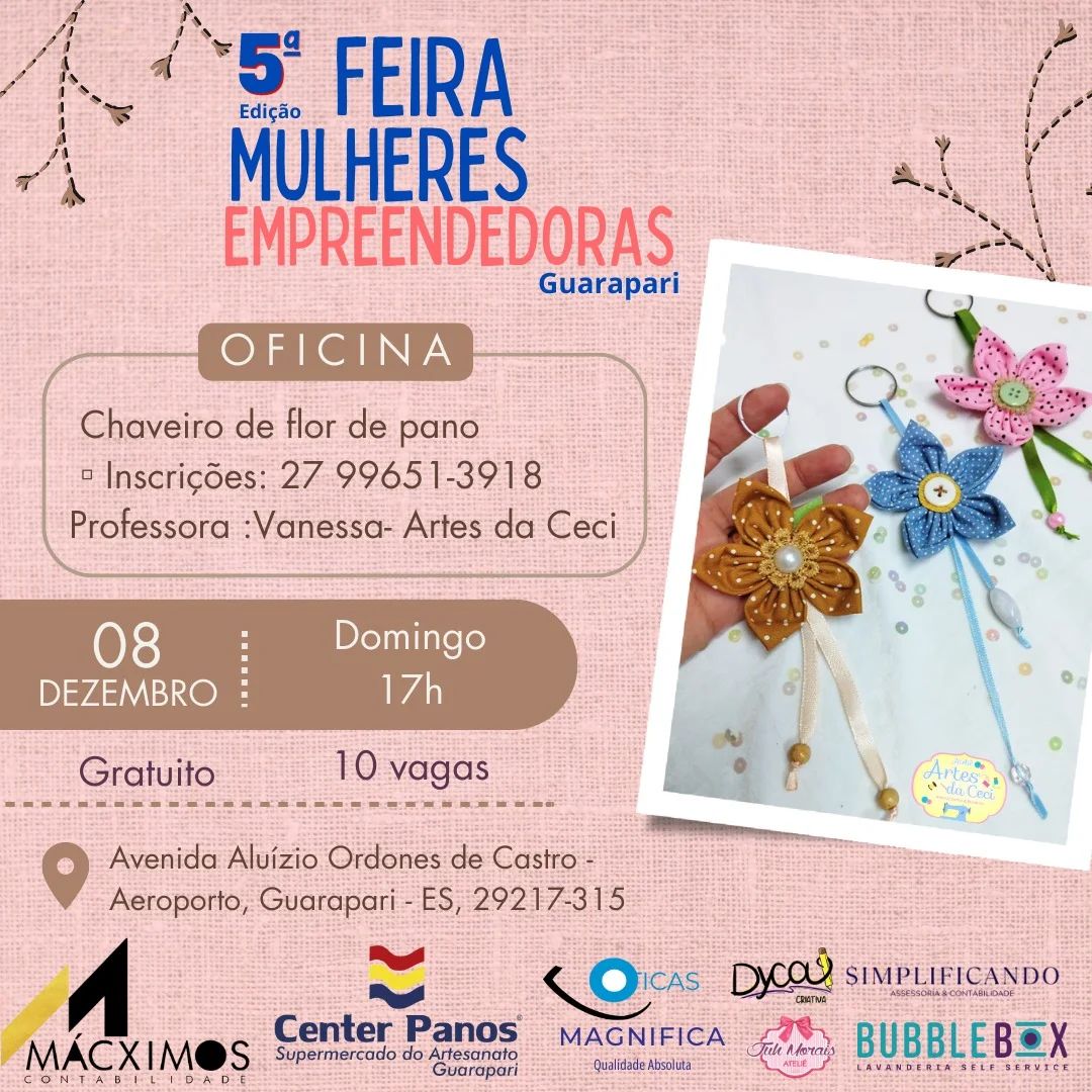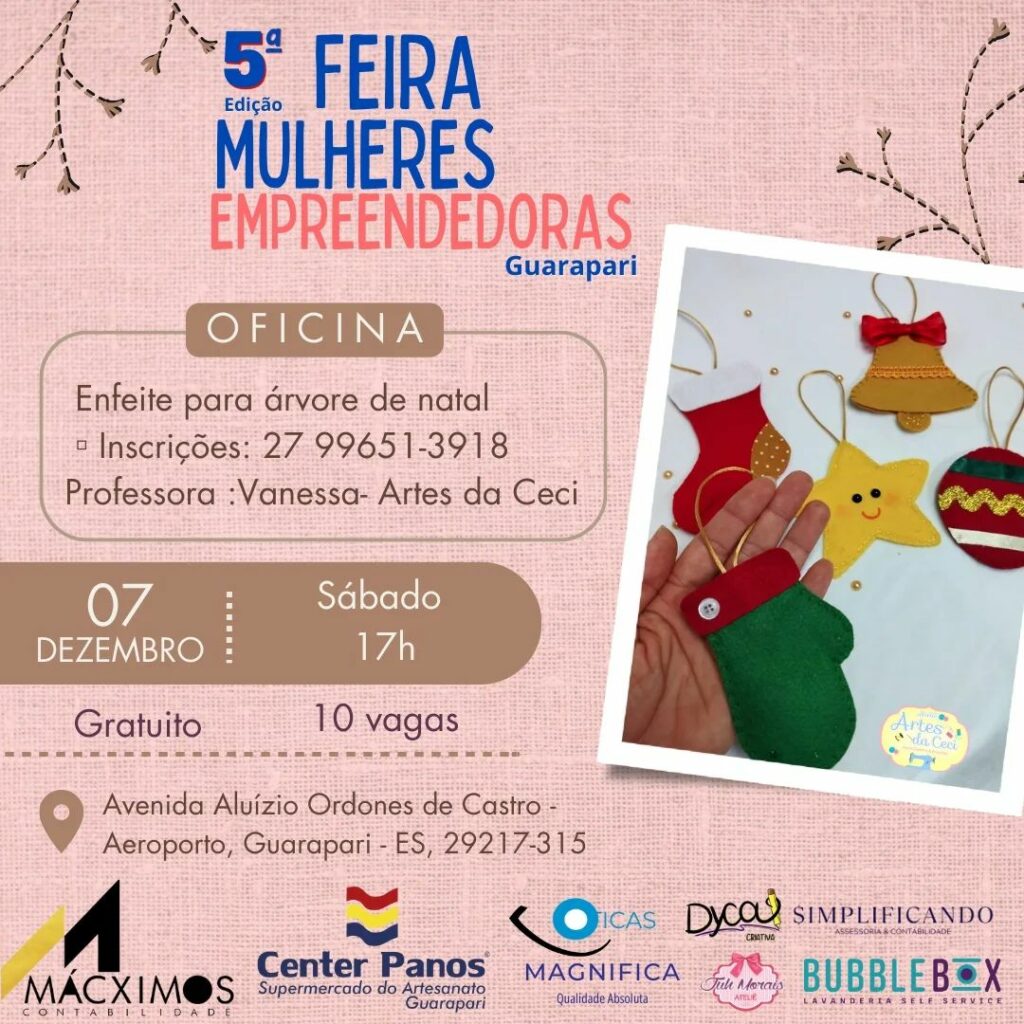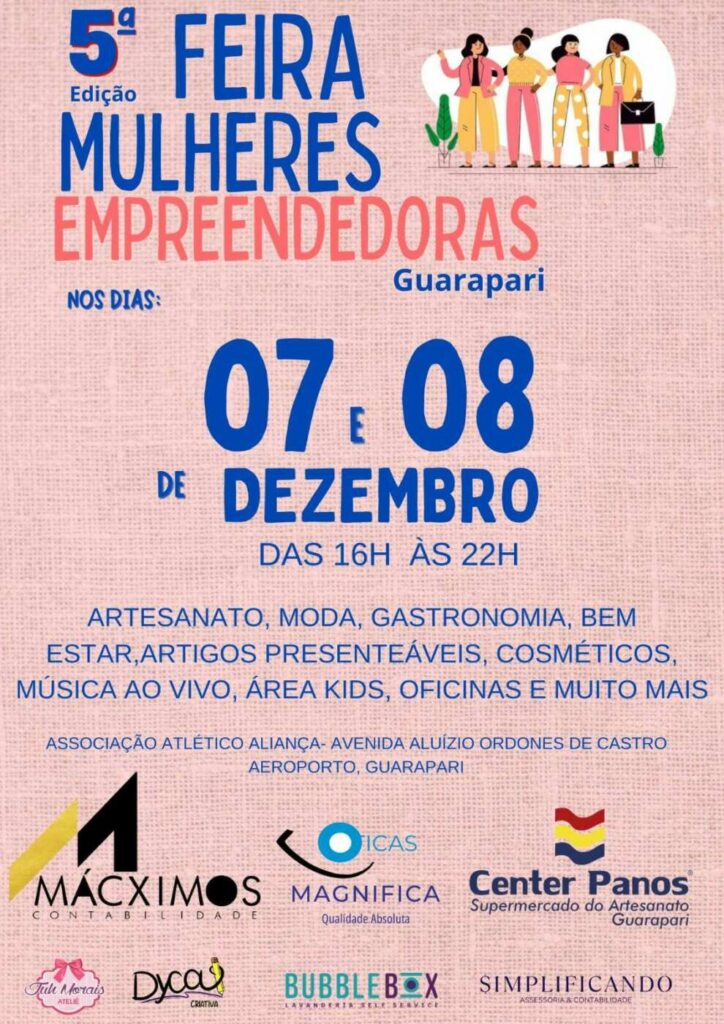 A 5ª Feira Mulheres Empreendedoras de Guarapari acontece nos dias 07 e 08 de dezembro, na Associação Atlética Aliança, trazendo atrações e novidades que prometem atrair ainda mais visitantes. O evento, que celebra o empreendedorismo feminino e busca promover a união e inclusão, contará com 65 expositoras apresentando uma ampla variedade de produtos, desde acessórios e moda até artesanatos e itens para pets.