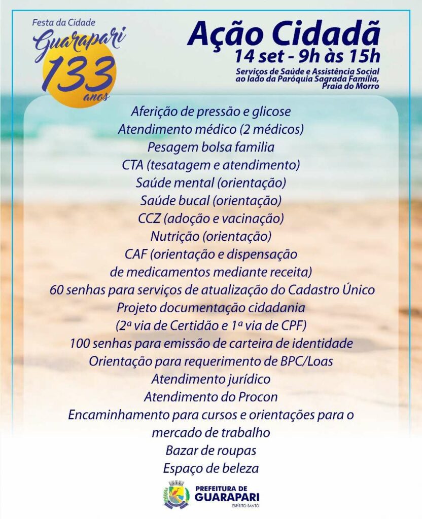 Em comemoração aos 133 anos de emancipação política de Guarapari, a ação ofertará serviços de saúde como aferição de pressão e glicose, atendimento médico, orientação de saúde bucal, nutrição e saúde mental, além de vacinação Antirrábica para cães e gatos, adoção de animais, medicação com receita, testes rápidos para sífilis, hepatites B e C e HIV.
