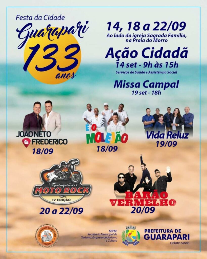 Na quarta-feira (18), o grupo de pagode Molejo sobe ao palco às 21h, seguido pela dupla sertaneja João Neto e Frederico, às 23h. No dia 19, aniversário de Guarapari, a celebração começa com uma missa festiva às 18h e, em seguida, a música fica por conta da banda Vida Reluz.