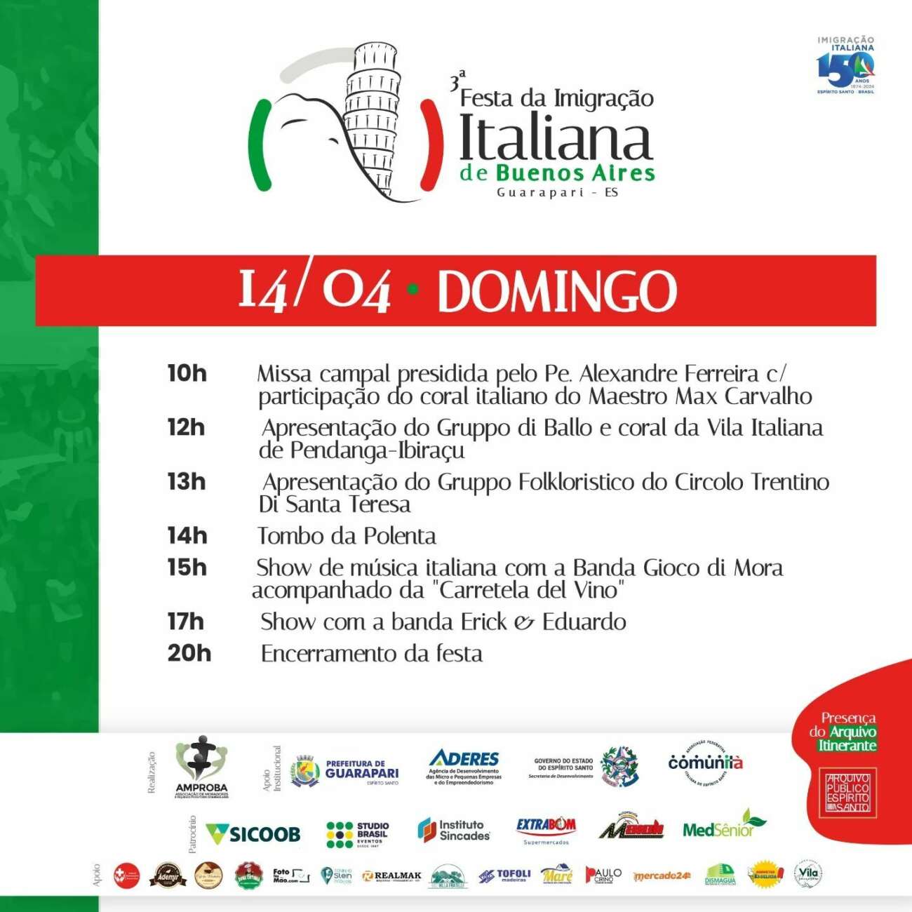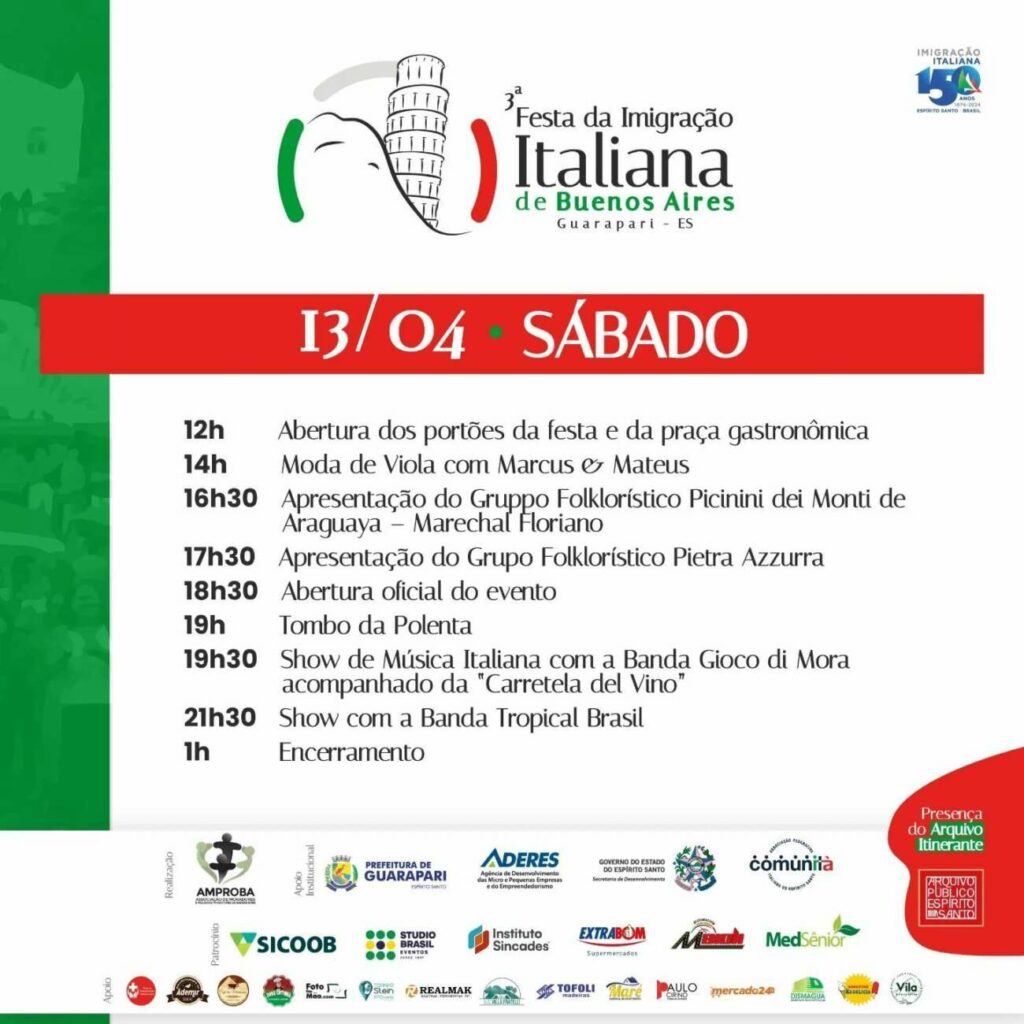 Nos dias 13 e 14 de abril, a região de Buenos Aires, em Guarapari, recebe a terceira edição da Festa da Imigração Italiana. Realizada pela Associação de Moradores (Amproba), o evento vai contar com uma extensa programação com atrações artísticas e gastronômicas e tem a expectativa de reunir cerca de 15 mil pessoas durante os dois dias.