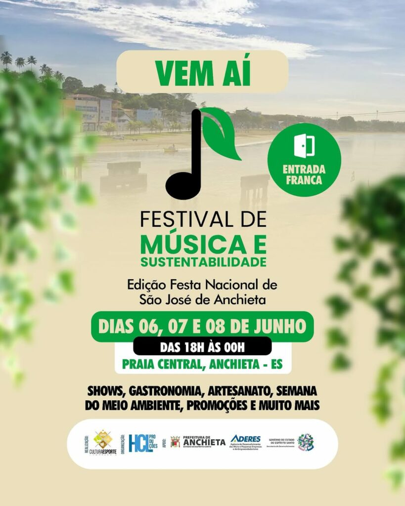 Com o objetivo de promover cultura, economia criativa e consciência ambiental, o Festival de Música e Sustentabilidade – Edição Festa Nacional de São José de Anchieta será realizado entre os dias 6 e 8 de junho, na praia central de Anchieta. O evento fará parte das festividades em homenagem a São José de Anchieta e acontecerá das 18h às 00h com entrada gratuita.