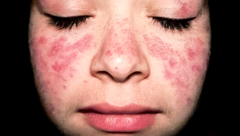 – lesões de pele: as lesões mais características são lesões avermelhadas em maçãs do rosto e dorso do nariz;