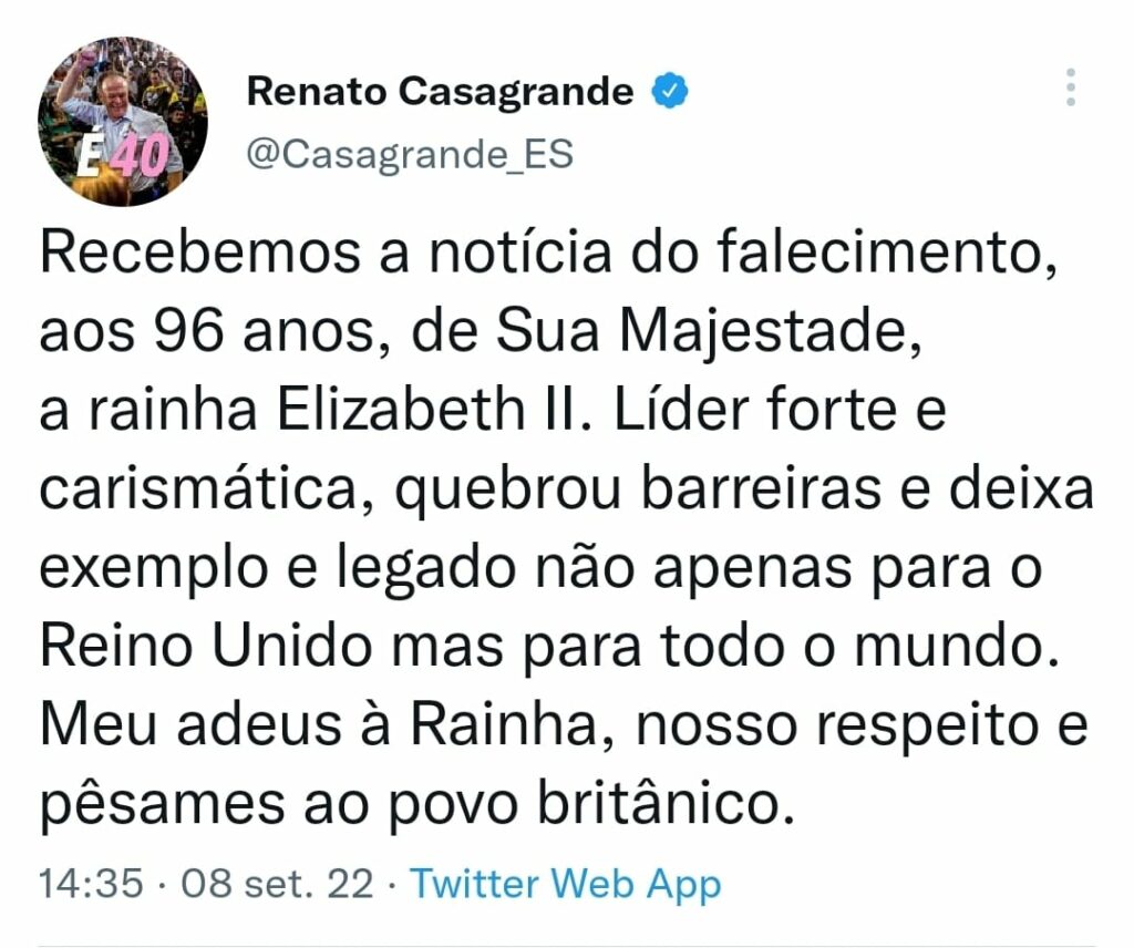 Renato Casagrande, governador do Espírito Santo, lamentou a morte da Rainha Elizabeth II, que faleceu nesta quinta (08).