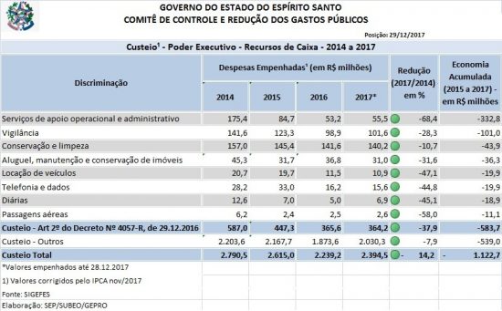 No dia02 de janeiro, Paulo Hartung assinou um novo decreto (Decreto Nº 4197-R) estabelecendo que os órgãos da administração direta e indireta fundacional deverão manter medidas de redução de despesas no atual exercício. Com isso, cada secretário assumirá a responsabilidade por manter o controle das despesas de custeio da sua pasta no patamar estabelecido no orçamento. A Secretaria de Estado de Planejamento (SEP) vai atuar monitorando o nível dessas despesas visando garantir que se mantenham nos limites previstos. Se houver necessidade, o Comitê atuará garantindo o cumprimento do teto de gastos.