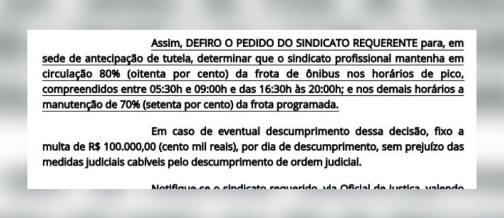Dessa forma, a justiça determinou que os trabalhadores mantenham 80% da frota em circulação nos horários de pico, compreendidos entre 05h30 e 09h e entre 16h30 e 20h; bem como a circulação de 70% da frota programada nos demais horários.