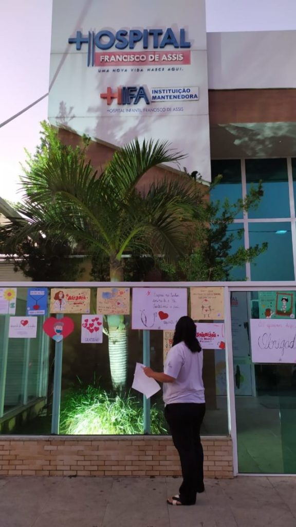 Por meio de cartazes com mensagens de carinho fixados na fachada do hospital, o grupo demonstrou gratidão pela dedicação dos profissionais