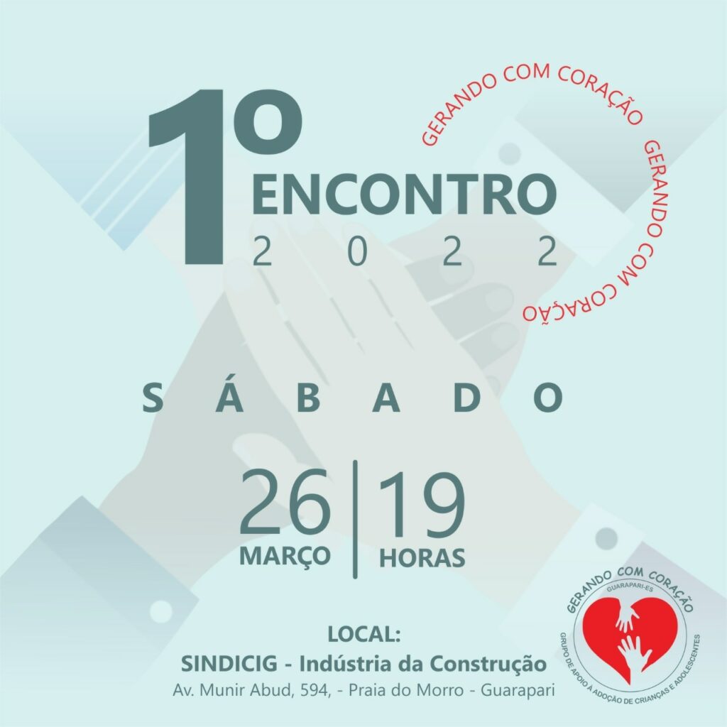Nesse sábado (26), às 19h, acontecerá o 1º Encontro 2022 realizado pelo grupo de apoio à adoção de Guarapari, “Gerando com Coração”. Após dois anos com as atividades presenciais suspensas por conta da pandemia da Covid-19, o grupo irá se reunir para tirar dúvidas sobre a adoção responsável.