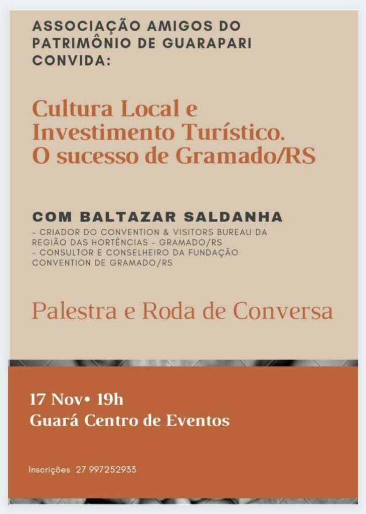 Nesta quarta-feira (17) a Associação Amigos do Patrimônio de Guarapari realizará palestra e roda de conversa sobre o tema “Cultura Local e Investimento Turístico, O sucesso de Gramado (RS)”. A oitava palestra da associação conta com a participação de Baltazar Saldanha, criador do “Convention & Visitors Bureau” da região das hortênsias, além de consultor e conselheiro da Fundação Convention de Gramado (RS).