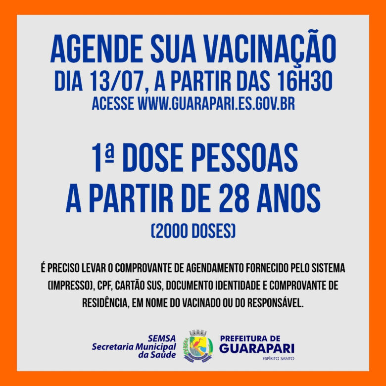 A Prefeitura de Guarapari, por meio da Secretaria Municipal de Saúde (Semsa), abre nesta terça-feira (13), às 16h30, o primeiro agendamento para pessoas acima de 28 anos, que irão receber a primeira dose da vacina contra a Covid-19.
