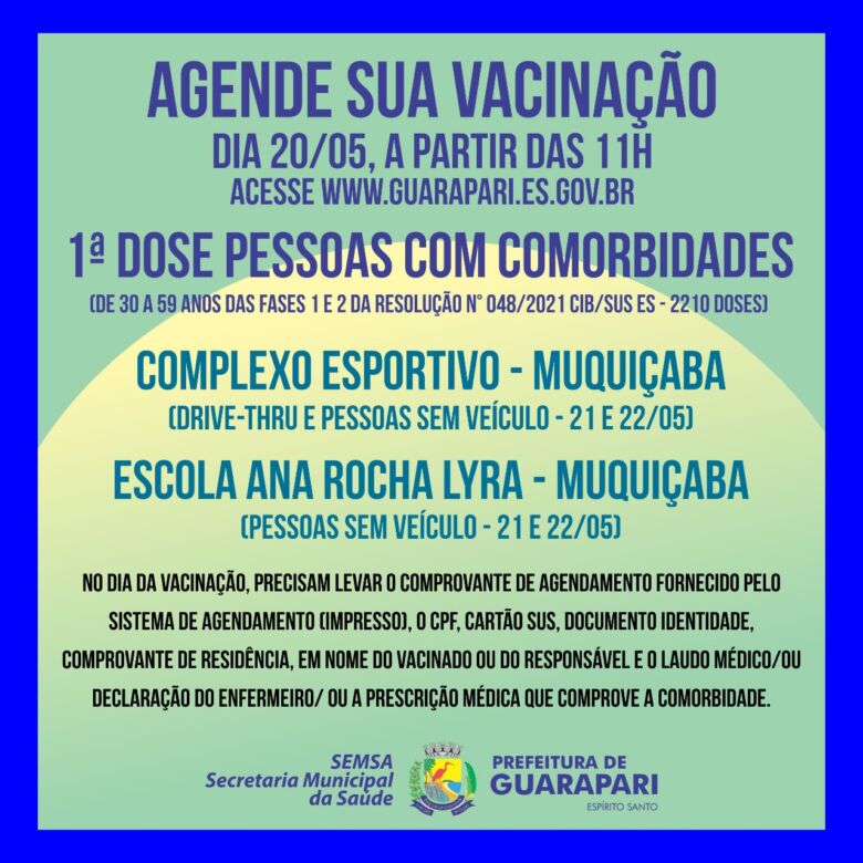 A Prefeitura de Guarapari, por meio da Secretaria Municipal de Saúde (Semsa), abre nesta quinta-feira (20), a partir das 11h, o agendamento para vacinação contra Covid-19, 1º dose, de pessoas com comorbidades, de 30 a 59 anos, pertencentes às fases 1 e 2 da Resolução N° 048/2021 CIB/SUS ES.