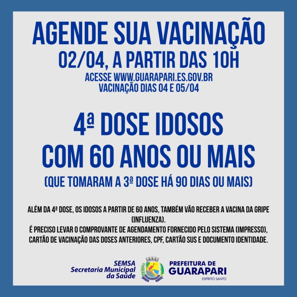 Na manhã deste sábado (02), a Prefeitura de Guarapari vai disponibilizar o agendamento para a aplicação da 4ª dose de vacinas da Covid-19 para pessoas com 60 anos ou mais. O link para acesso ao sistema de agendamento será disponibilizado no site da prefeitura.