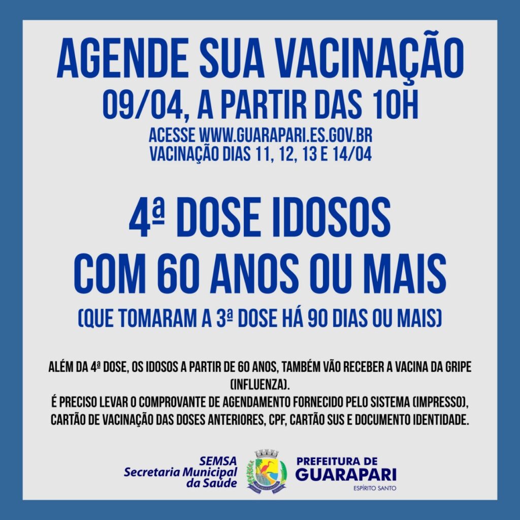 O agendamento é voltado para pessoas que já receberam a 3ª dose da vacina há 90 dias ou mais. Além da 4ª dose da vacina da Covid-19, os idosos a partir de 60 anos, também vão receber a vacina da gripe (Influenza) no momento da aplicação do imunizante.