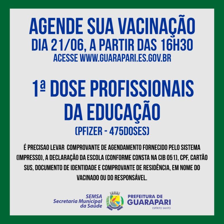 A Prefeitura de Guarapari, através da Secretaria de Saúde (Semsa), abre nesta segunda-feira (21), às 16h30, um novo agendamento para a primeira dose da vacina contra a Covid-19, destinada aos profissionais da educação ativos.