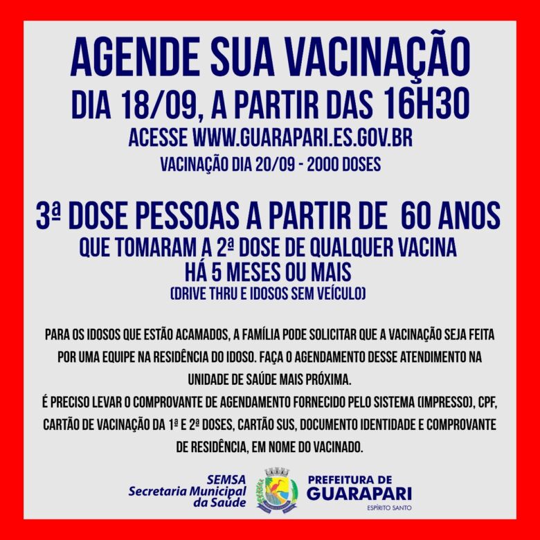 A Prefeitura de Guarapari, por meio da Secretaria Municipal de Saúde (Semsa), abrirá neste sábado (18), às 16h30, um novo agendamento para aplicação da terceira dose da vacina contra a Covid-19. Neste primeiro momento serão atendidos os idosos com 60 anos ou mais, que tenham tomado a segunda dose de qualquer imunizante contra a Covid-19 há cinco meses ou mais.