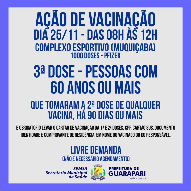 A Prefeitura de Guarapari, por meio da Secretaria Municipal de Saúde (Semsa), está realizando nesta quinta-feira (25), das 08h às 12h, o mutirão de vacinação da terceira dose contra a Covid-19, para idosos com 60 anos ou mais, que tenham tomado a segunda dose de qualquer imunizante contra a Covid-19 há três meses ou mais.  A vacinação será no Complexo Esportivo, em Muquiçaba.
