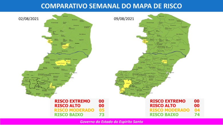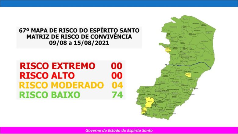 O Governo do Estado anunciou, nesta sexta-feira (06), o 67º Mapa de Risco Covid-19, que terá vigência desta segunda-feira (09) até o próximo domingo (15). Dos 78 municípios capixabas, 74 estão classificados em Risco Baixo e apenas quatro em Risco Moderado. Não há municípios classificados em Risco Alto.