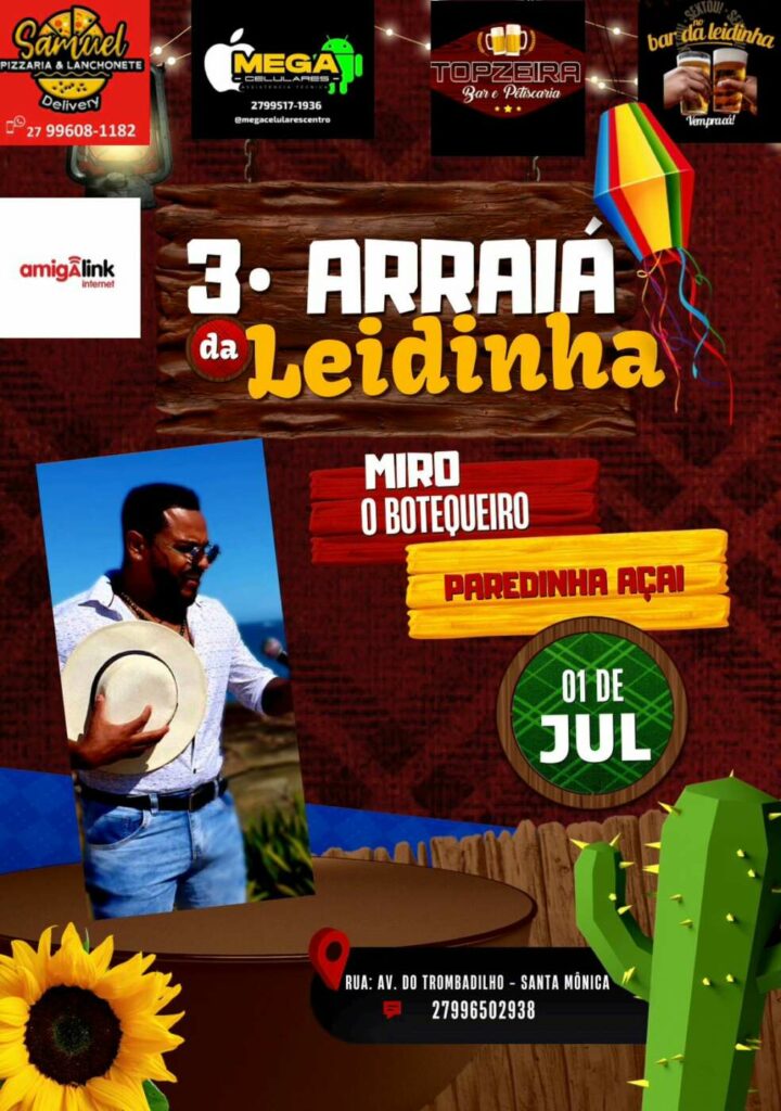 Em sua terceira edição, o Arraia da Leidinha acontece nesse final de semana (01), a partir da 18h, e promete movimentar o bairro de Santa Mônica, em Guarapari.