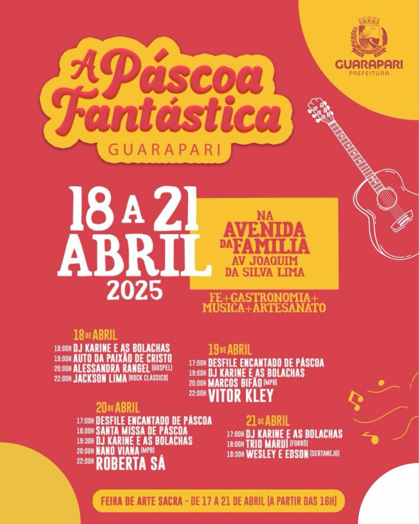 Com shows nacionais, parada temática, feira de arte sacra e praça de gastronomia, Guarapari se prepara para receber A Fantástica Páscoa, evento que promete movimentar a cidade entre os dias 18 e 21 de abril. A programação gratuita acontece no Centro e na Praia do Morro, com atrações para todas as idades.