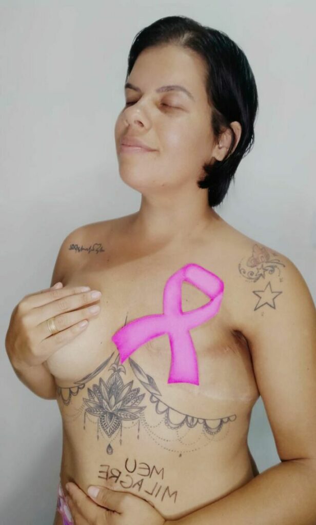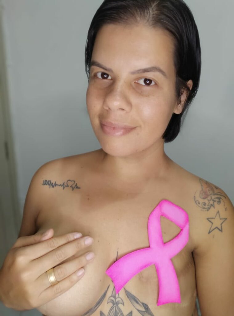“Minha avó teve câncer de mama, mas eu não fazia exames. Uma vez senti um nódulo, mas ignorei. Quando eu fiz a biópsia, não criei expectativas; mas deu positivo para o câncer. Por ser tardio, precisei fazer um protocolo de quimioterapia, para depois fazer a cirurgia. E aí eu fiz oito quimioterapias, em um intervalo de 20 dias de uma para outra. Com esta rotina de fortes sessões e medicamentos, eu segui até a confirmação da gravidez e devo voltar logo após o nascimento do bebê”, explica.