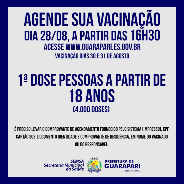 A Prefeitura de Guarapari, por meio da Secretaria Municipal de Saúde (Semsa), abre nesse sábado (28), às 16h30, o agendamento para pessoas acima de 18 anos que precisam tomar a primeira dose da vacina contra a Covid-19.