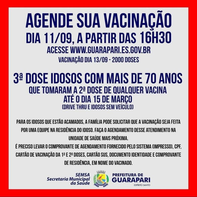 A informação foi divulgada na manhã desta sexta-feira (10), em postagem no perfil oficial da Prefeitura de Guarapari no Instagram. De acordo com o divulgado, serão agendadas 2.000 doses a serem aplicadas na próxima segunda-feira (13), com ou sem sistema de drive-thru (vacinação em veículo).