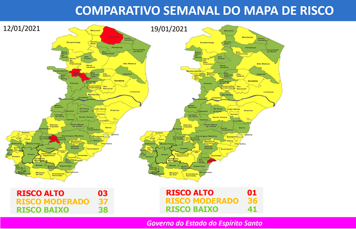 Em todo o estado, apenas a cidade de Piúma foi classificada como de risco alto. A cidade de Alfredo Chaves está classificada como de risco baixo.