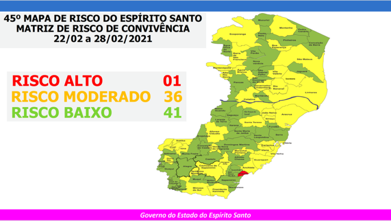 O Espírito Santo tem apenas um município classificado como de risco alto para a covid-19, segundo o 45° Mapa de Risco divulgado nesta sexta-feira (19) pelo governo do Estado. No novo Mapa, que entra em vigor a partir da próxima segunda-feira (22), Guarapari e Anchieta seguem classificadas como de risco moderado para a doença. O mapa terá vigência até o domingo seguinte (28).