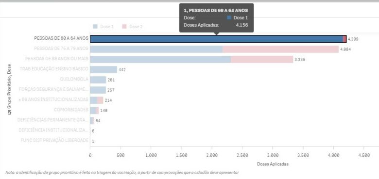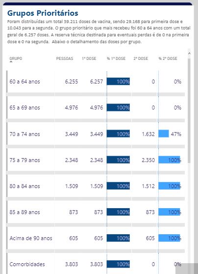O Painel de distribuição de doses do Governo do Estado, entretanto, mostra que um número maior de doses já foi disponibilizado ao município. Segundo o painel, o número é de 6.257 doses (D1) entregues para a vacinação do grupo de 60 a 64 anos. Sendo assim, um total de 856 doses constam como entregues ao município, mas não disponíveis para aplicação.