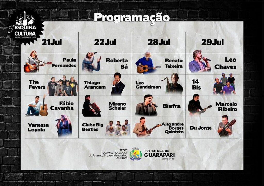 A Prefeitura de Guarapari definiu os dias de cada apresentação da 5ª edição do Esquina da Cultura. Mais de 15 atrações passarão por três palcos na avenida Joaquim da Silva Lima, no Centro, nos dias 21, 22, 28 e 29 de julho.