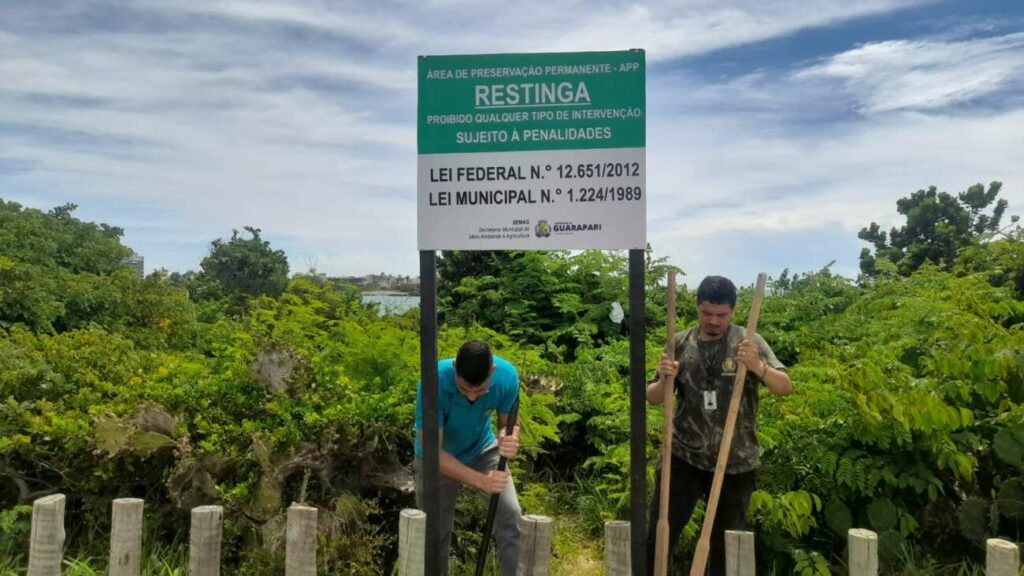 Na ação foram instaladas oito placas de identificação das áreas de restinga, sendo duas na orla da Praia de Bacutia, três na orla da Praia de Peracanga e mais três na orla da Praia de Guaibura.