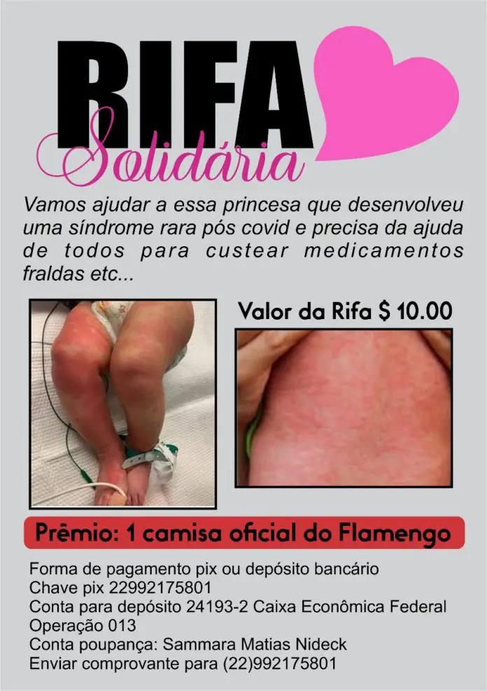 Por conta das dificuldades que está passando, uma amiga de Leidiane deu uma camisa oficial do Clube de Regatas do Flamengo para ser rifada. “Minha amiga mora no Rio de Janeiro e arrumou essa forma de ajudar. Como são 500 números para serem escolhidos, a blusa será sorteada entre julho e agosto, assim que tudo for vendido. Cada número custa 10 reais e os valores arrecadados serão revertidos para me ajudar no tratamento da Isabela”.