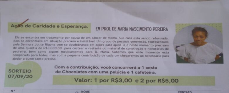 Depois de reformar a casa de Dona Maria, que vivia em condições precárias, a comunidade está fazendo uma rifa para arcar com os custos do tratamento