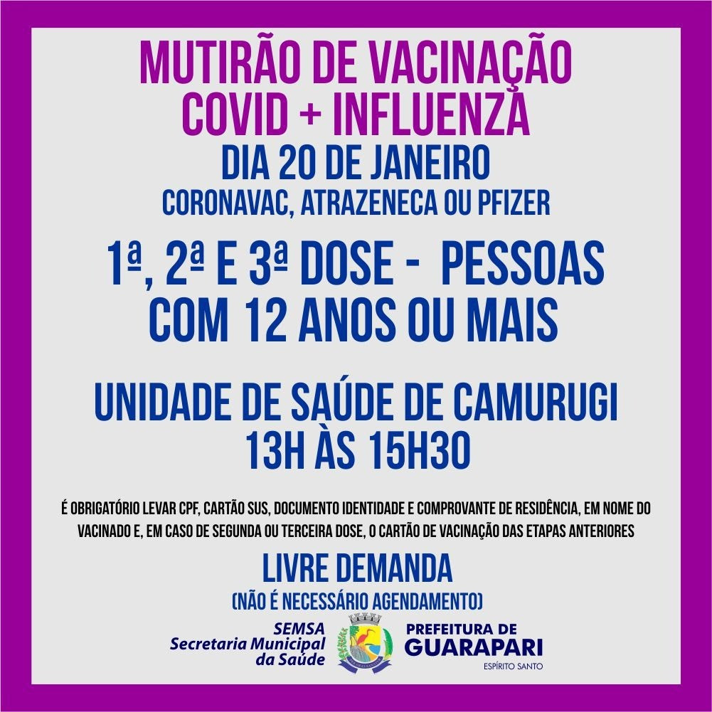 A Prefeitura de Guarapari, através da Secretaria Municipal de Saúde (Semsa), realiza nesta quinta-feira (20), mais um mutirão de vacinação da Covid e Influenza, sem agendamento, na Unidade de Saúde do Camurugi, de 13h às 15h30.