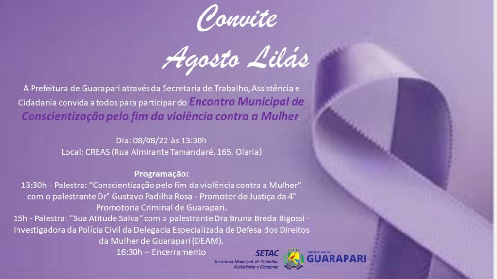 O evento faz parte da Campanha Agosto Lilás, que tem por finalidade a conscientização de indivíduos de todas as idades quanto à violência doméstica e familiar contra a mulher.