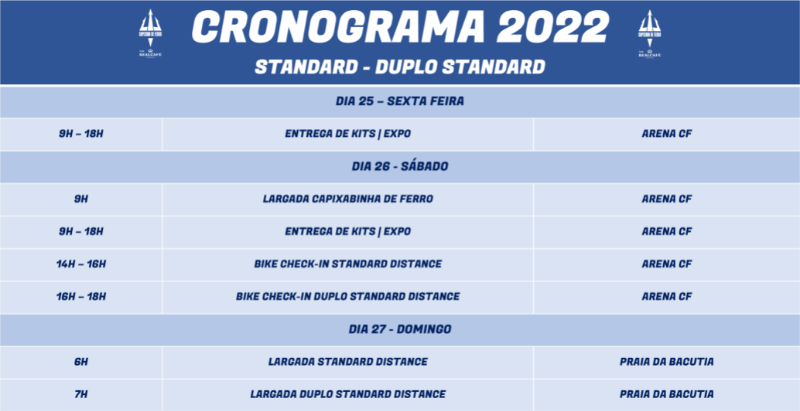 A primeira largada do evento principal acontece às 6h da manhã de domingo (27), na Praia da Bacutia, com os atletas da prova Standard (1,5 km de natação, 40 km de ciclismo e 10 km de corrida). Às 7h, acontece a largada da prova Duplo Standard Duplo Standard Distance (3 km de natação, 80 km de ciclismo e 20 km de corrida).