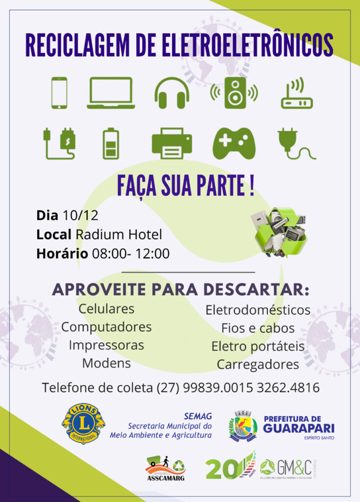 No próximo sábado (10), das 8h às 12h, o Radium Hotel, no Centro de Guarapari, recebe o Coleta Seletiva de Eletroeletrônicos. O projeto é do Lions Clube Guarapari, em parceira com a GM&C (Empresa de reciclagem de equipamentos eletroeletrônicos e produtos perigosos), ASSCAMARG (Associação de Catadores de Materiais Recicláveis de Guarapari) e Prefeitura Municipal de Guarapari.