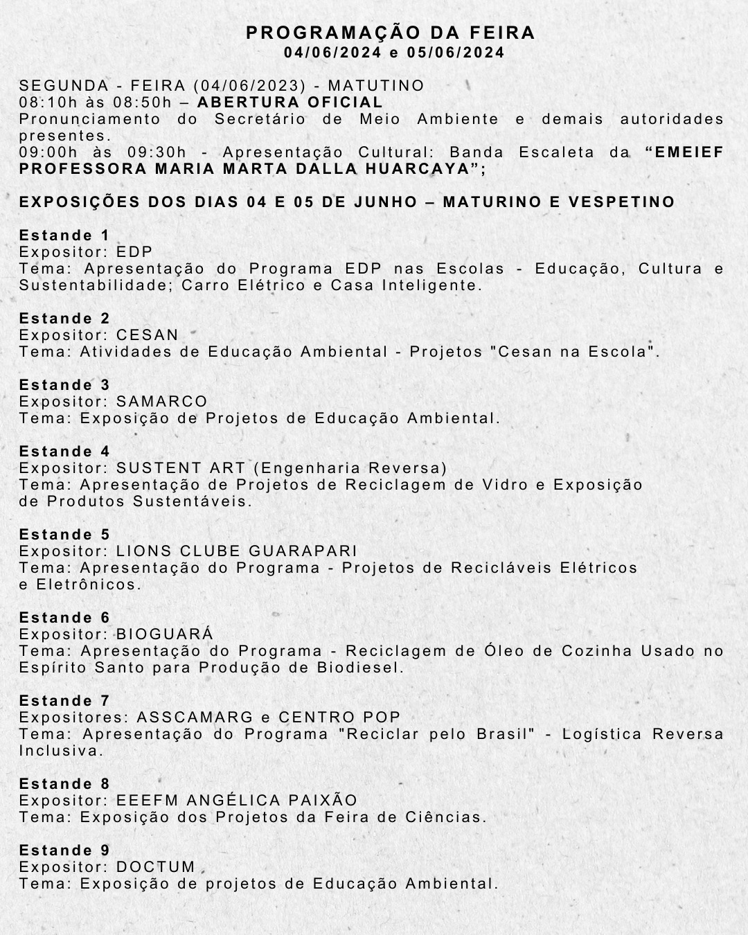 Neste ano de 2024, a Feira de Meio Ambiente de Guarapari apresentará o tema Conservação dos Ecossistemas Naturais. O objetivo é conscientizar a população em geral sobre a importância da diversidade biológica e sua conservação em todos os ecossistemas.