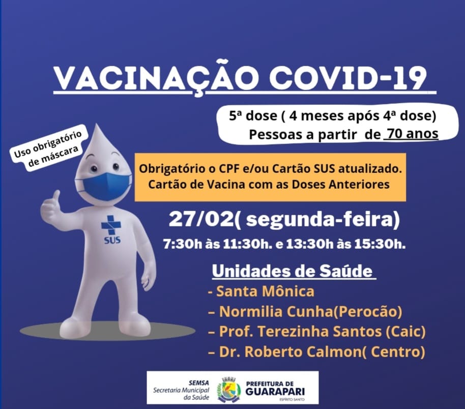 A Prefeitura de Guarapari realiza nesta segunda-feira (27) a Ação de Vacinação covid-19 para pessoas a partir de 70 anos que precisam tomar a 5ª dose da vacina, com quatro meses após a 4ª dose.