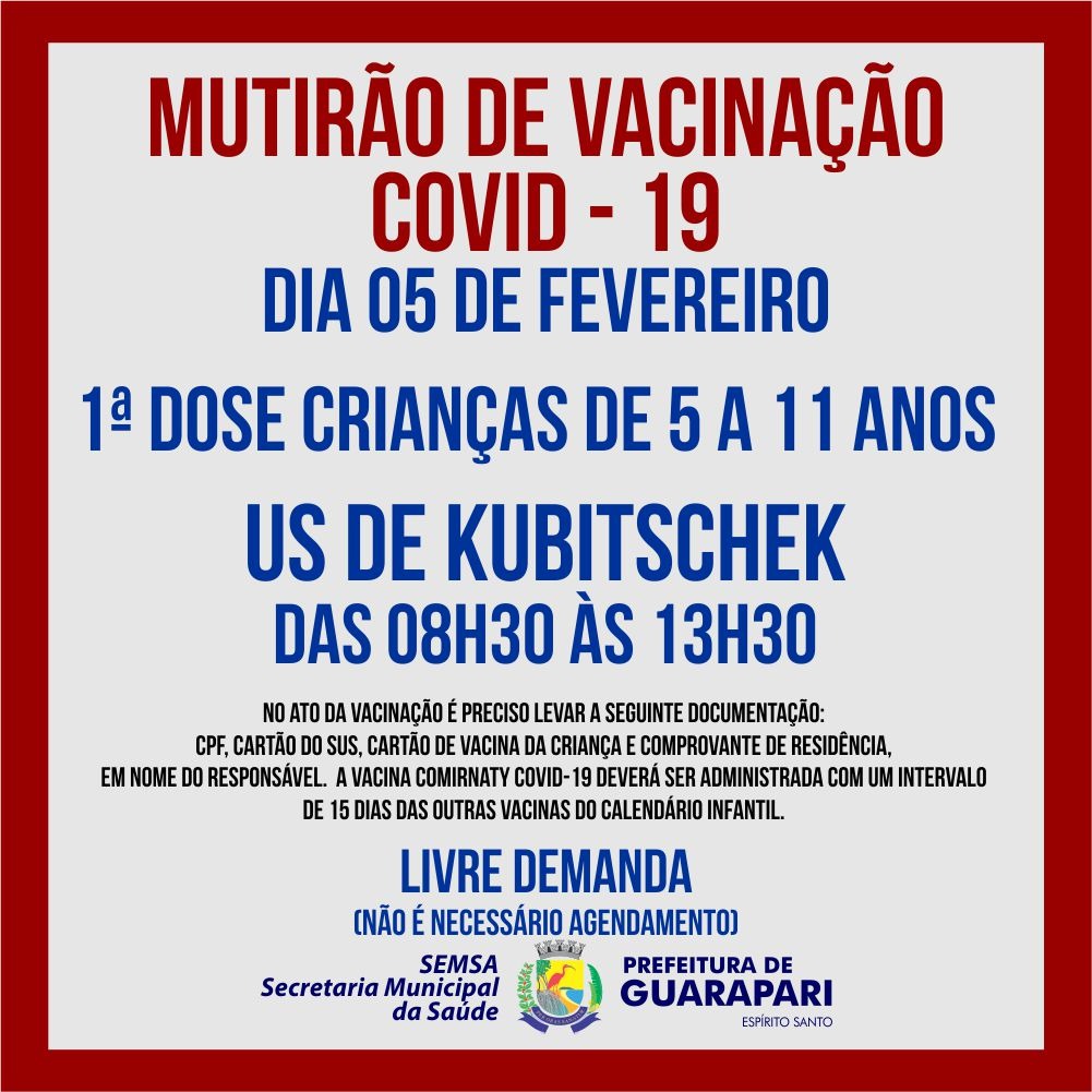 A Prefeitura de Guarapari, através da Secretaria Municipal de Saúde (Semsa), realiza nesse sábado (05), uma ação de vacinação contra a Covid-19 para crianças de 05 a 11 anos, na Unidade de Saúde do bairro Kubitscheck, sem agendamento, livre demanda.