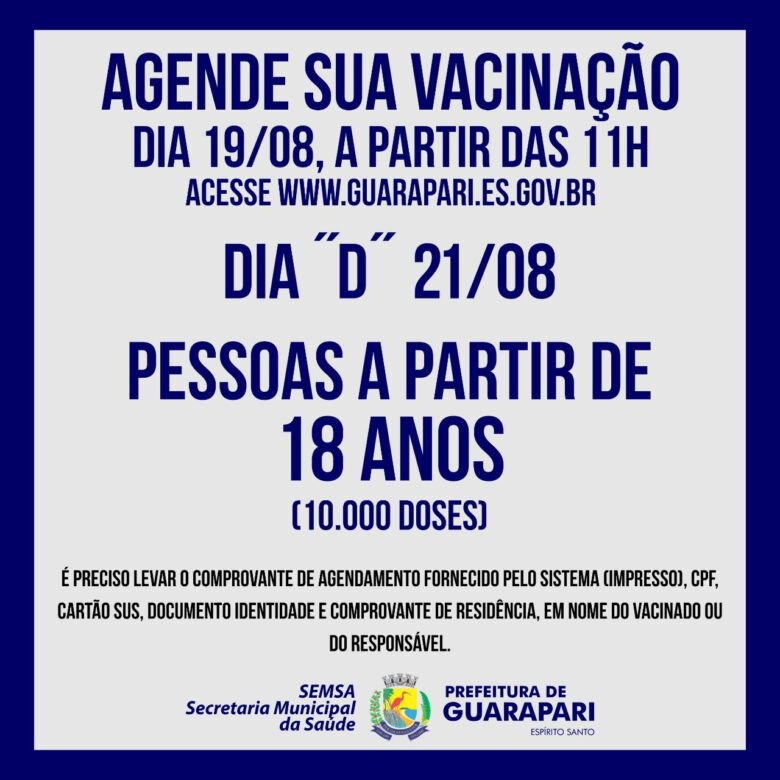 A Prefeitura de Guarapari, através da Secretaria Municipal de Saúde (Semsa), realiza no próximo sábado (21), o Dia “D” de vacinação contra a Covid-19, voltada para pessoas com 18 anos ou mais, que precisam tomar a primeira dose. O agendamento será realizado nessa quinta-feira (19), às 11h.