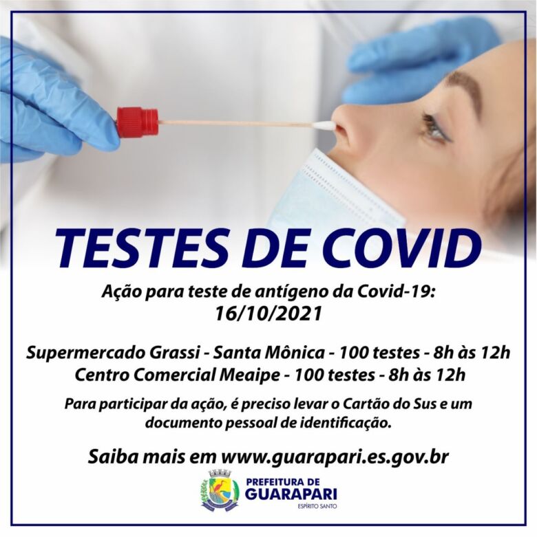 A Prefeitura de Guarapari, através da Secretaria de Saúde (Semsa), realiza nesse sábado (16), mais ação para teste de antígeno da Covid-19. Os bairros contemplados serão Santa Mônica e Meaípe.