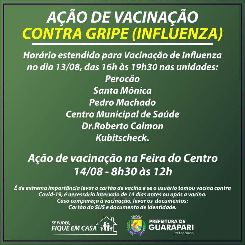 Guarapari divulgou, na manhã desta quinta-feira (12), a realização duas novas ações de vacinação coontra o vírus da gripe. A primeira ação vai acontecer nesta sexta (13) nas unidades de Saúde dos bairros Kubitscheck, Perocão, Santa Mônica, Bela Vista, Centro Municipal de Saúde e Dr. Roberto Calmon. Já no sábado (14), a ação acontece entre 8h e 12h, em uma tenda na feira livre do Centro de Guarapari.