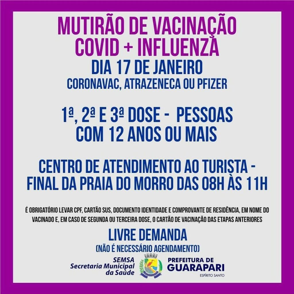 A Prefeitura de Guarapari, através da Secretaria Municipal de Saúde (Semsa), realiza nesta segunda-feira (17), mais um mutirão de vacinação contra a Covid-19 e Influenza, sem agendamento, no Centro de atendimento ao turista, localizado no final da Praia do Morro, das 08h às 11h.