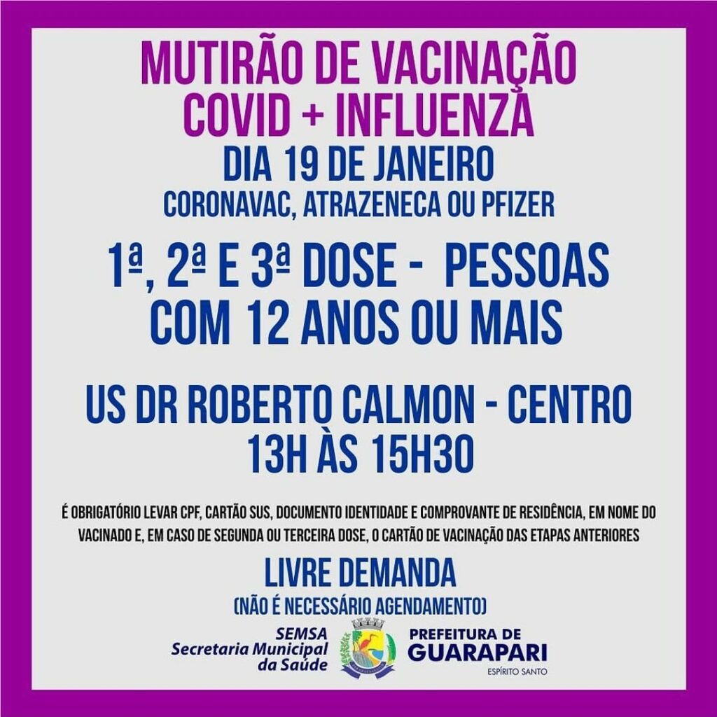 A Prefeitura de Guarapari, através da Secretaria Municipal de Saúde (Semsa), realiza nesta quarta-feira (19), mais um mutirão de vacinação sem agendamento contra a Covid-19 e Influenza, na Unidade de Saúde Dr. Roberto Calmon, no Centro da cidade, das 13h às 15h30.