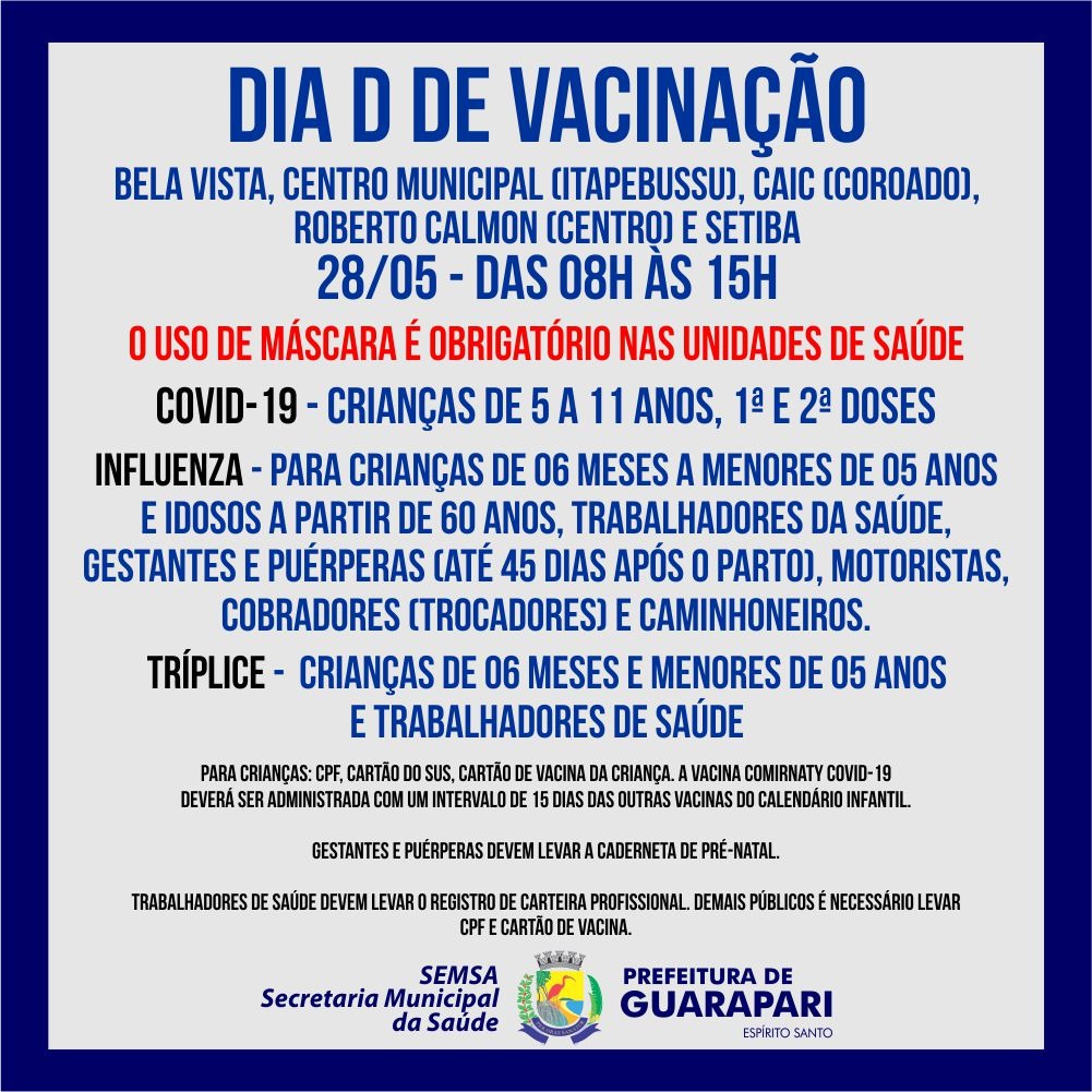 A Prefeitura de Guarapari, através da Secretaria Municipal de Saúde (Semsa), está realizando neste sábado (28), mais um Dia D de Vacinação, com o objetivo de imunizar a população contra Covid-19, Influenza e aplicar a vacina tríplice viral em várias unidades de saúde.