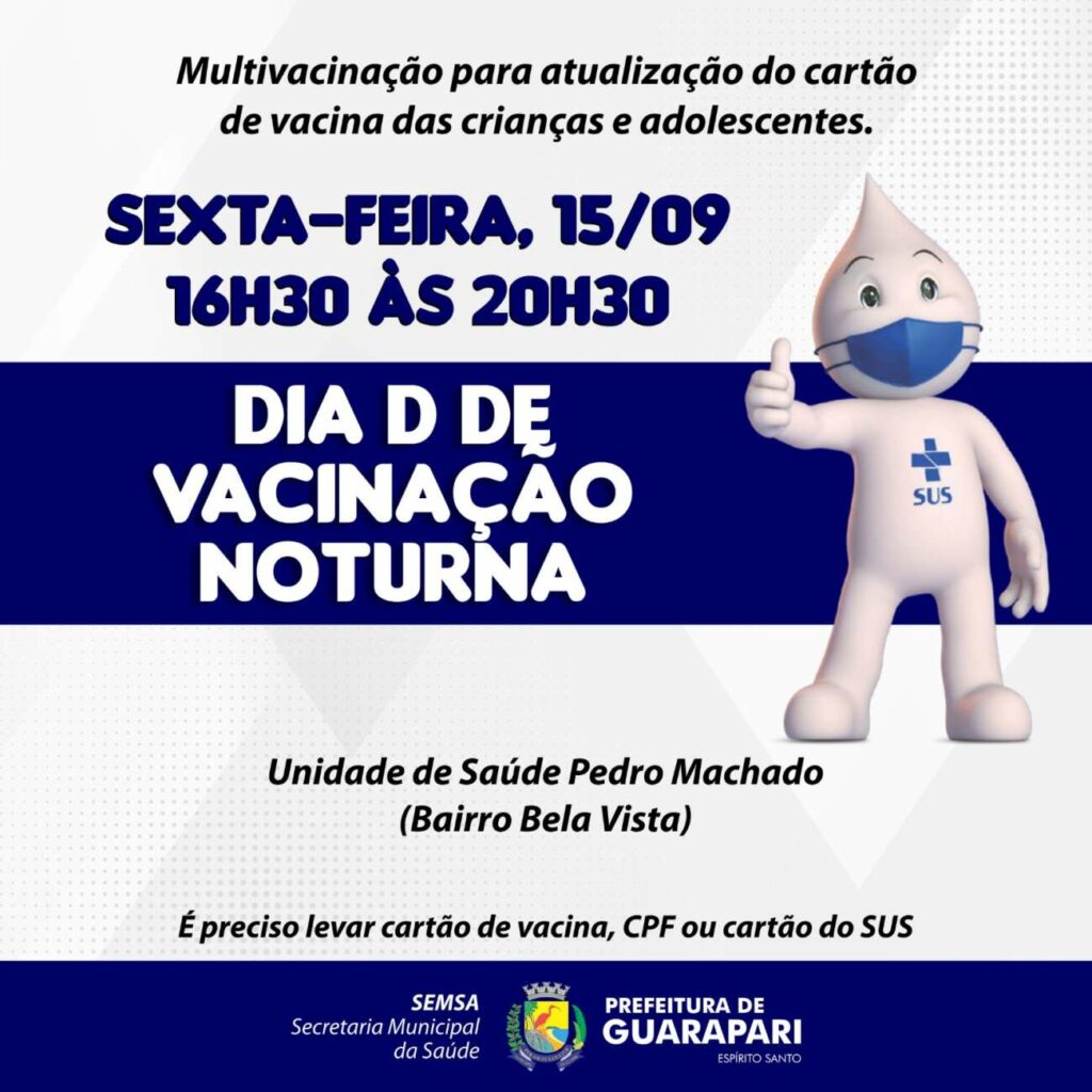 A Prefeitura de Guarapari, através da Secretaria Municipal de Saúde (Semsa), realiza nesta sexta-feira (15), o Dia D de Multivacinação Noturna, para atualização do cartão de vacina das crianças e adolescentes.