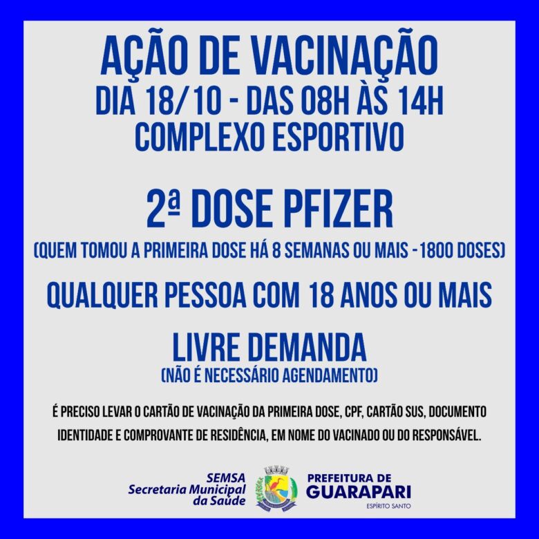 A Prefeitura de Guarapari, por meio da Secretaria Municipal de Saúde (Semsa), realiza nesta segunda-feira (18), mais uma ação de livre demanda para qualquer pessoa com mais de 18 anos que precisa tomar a segunda dose da vacina Pfizer.