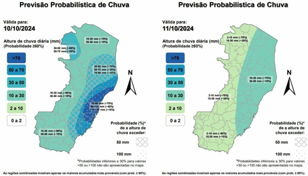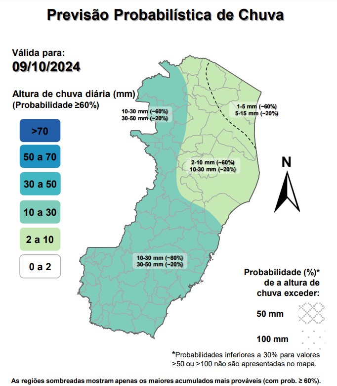 Na Grande Vitória, a previsão para esta quinta-feira indica probabilidade de acumulados de chuva de 70 a 90 mm, podendo ultrapassar 100 mm em algumas áreas isoladas. Para o leste do estado, a precipitação deve ficar entre 30 a 50 mm, com possibilidade de volumes maiores, chegando a 70 mm.