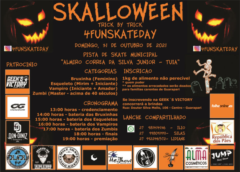 No próximo domingo (31) Guarapari recebe na pista pública de skate da Prainha, a 2ª edição do Campeonato de Skate 4FUNSKATEDAY – SKALLOWEEN.