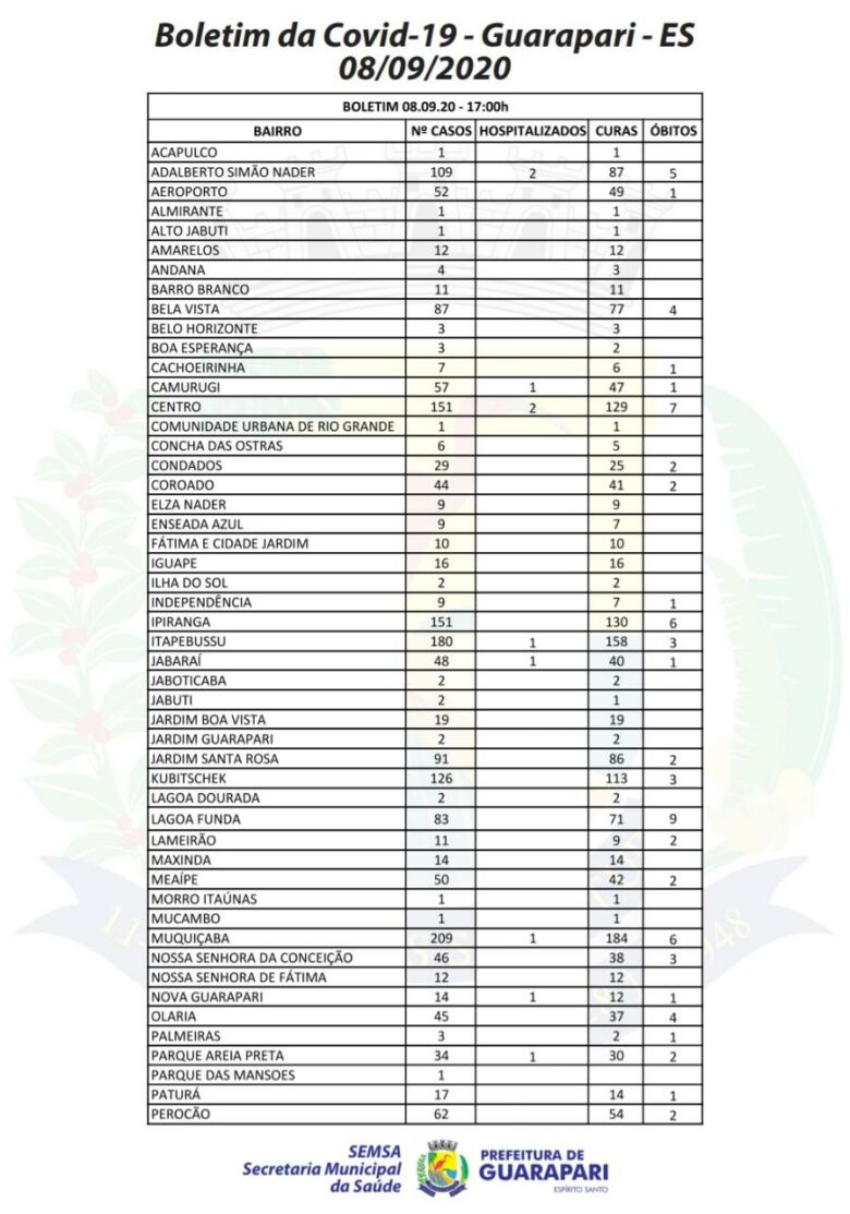 O boletim epidemiológico mais recente, divulgado ontem (08), pela Prefeitura de Guarapari, por meio da Secretaria Municipal da Saúde, atualiza o número de casos confirmados do novo coronavírus no município para 2.997, 51 casos a mais que no dia anterior (07). O número de óbitos permanece inalterado.